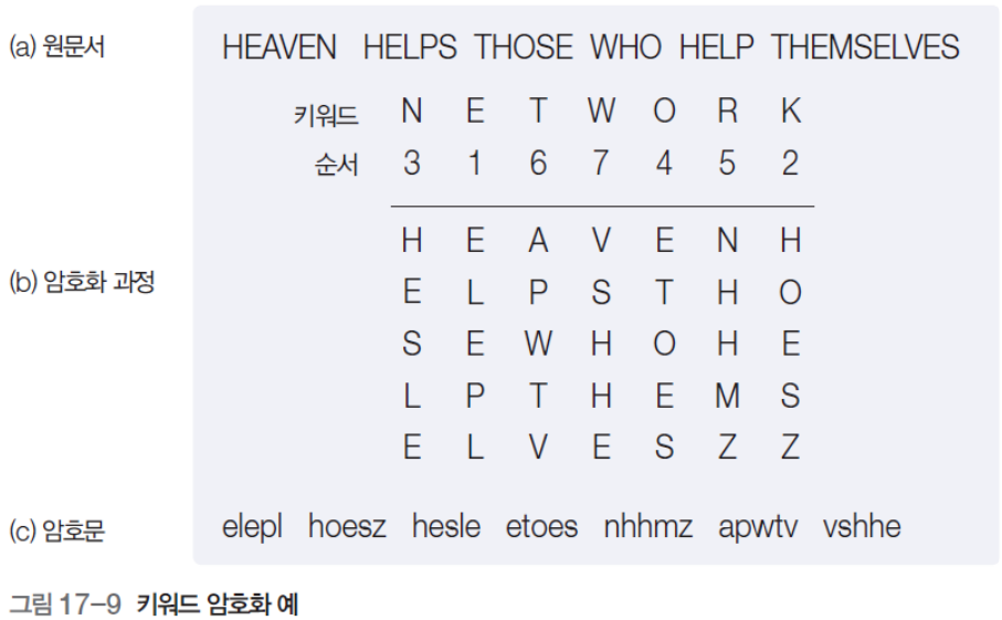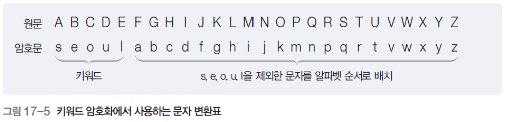 지정 단어를 암호문 앞줄에 적고, 키워드에 표시된 문자를 뺀 나머지 문자를 알파벳 순으로 기술하는 방식