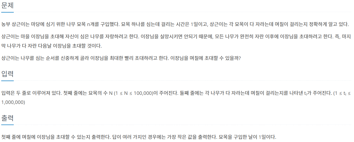 따라서 새로운 리스트는 tree[i] = tree[i] + i + 1이고 이장님을 초대할 수 있는 날은 (max(tree) + 1) 이다.