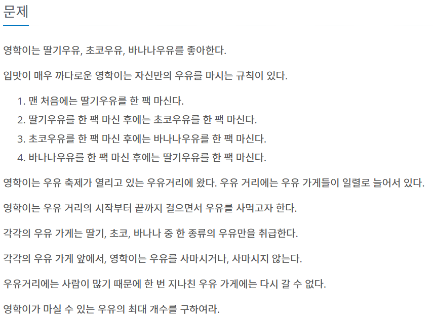 문제 풀이: 해당 문제는 0 - 1 - 2 - 0 순서로 마셔야 하기 때문에 milk[i]을 cnt를 3으로 나누어준 값으로 비교하면 된다.