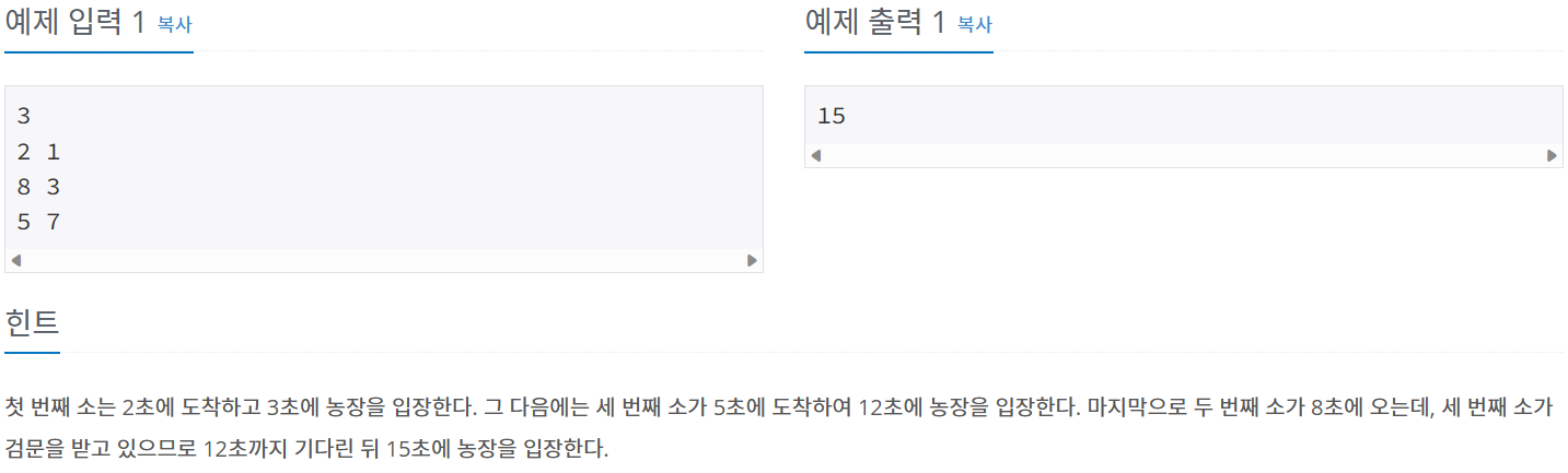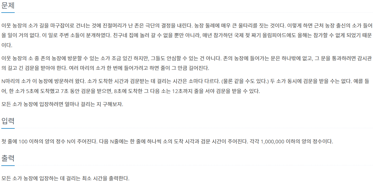 문제 풀이: 해당 문제는 먼저 소가 도착하는 시간을 기준으로 오름차순 정렬을 한다.