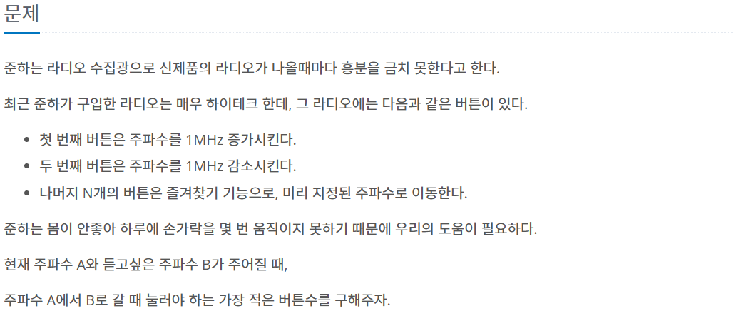 이 때, 최소한으로 버튼을 누르기 위해서 즐겨찾기 주파수와 목표 주파수의 차이가 가장 작게 만들어야 한다.