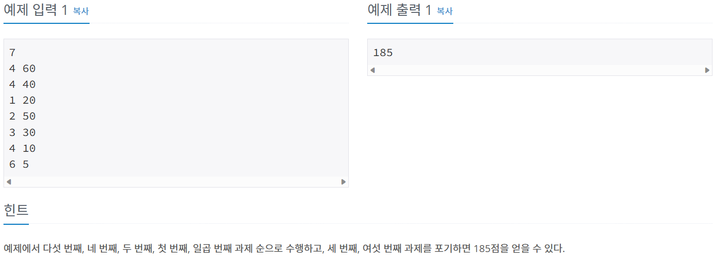 이 문제는 마감일이 큰 것부터 낮은 것까지 반복해 나가는 것이 핵심이다. 따라서 date는 n부터 1까지 거꾸로 진행해나가야 한다. (date를 1부터 반복하는 것은 최적의 해를 구할 수 없다.)