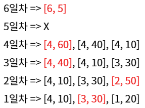 d.pop()에 의해 date가 4일 때 받을 수 있는 가장 높은 점수 60이 result에 더해진다.