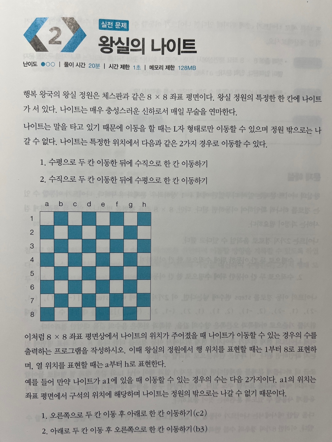 문제 해설: 왕실의 나이트 문제는 앞서 다루었던 '상하좌우' 문제와 유사하다. 나이트가 이동할 수 있는 경로를 하나씩 확인하여 이동하면 된다. 다만, 8 x 8 좌표 평면을 벗어나지 않도록 꼼꼼하게 검사하는 과정이 필요하다.