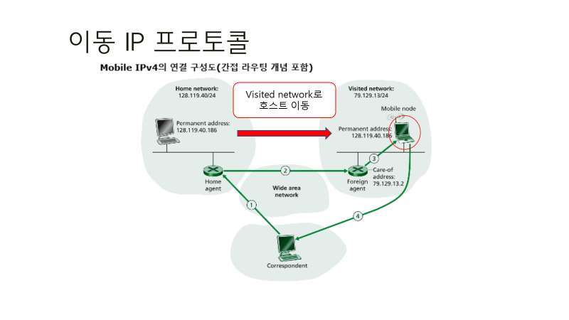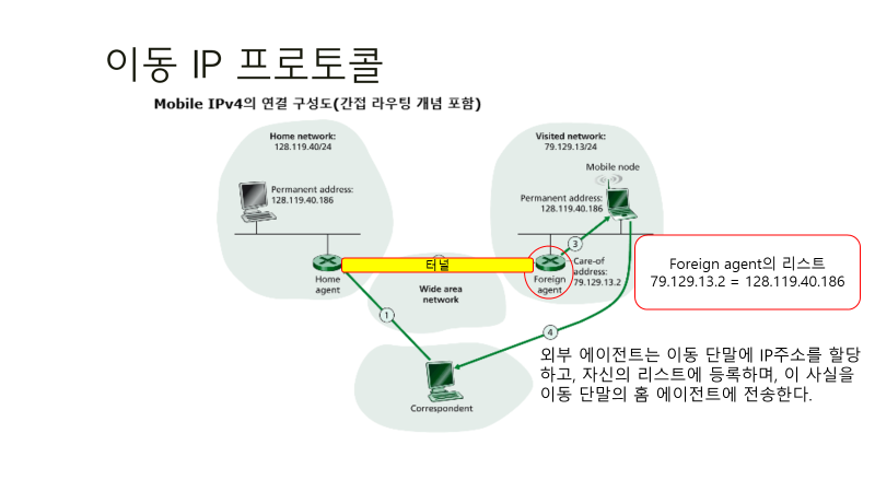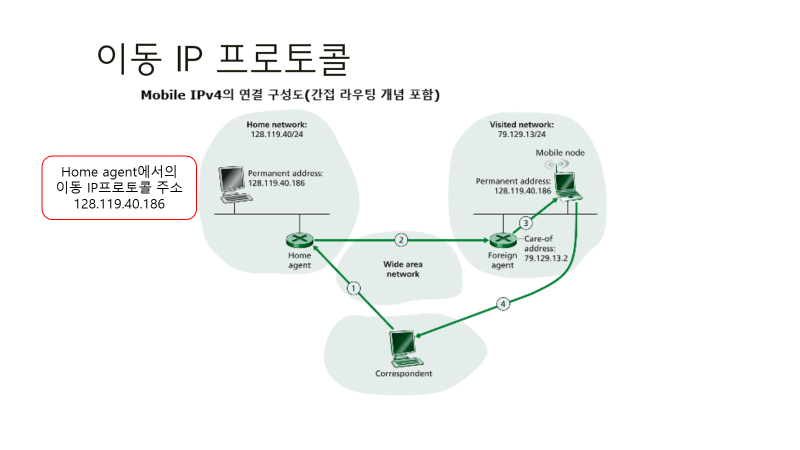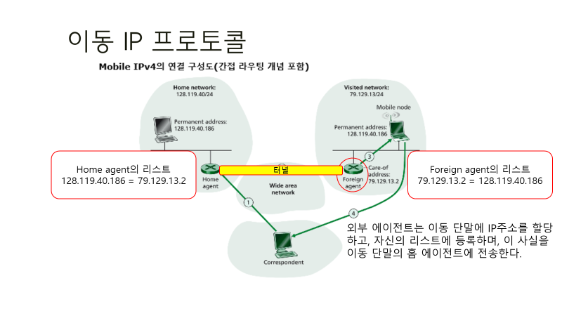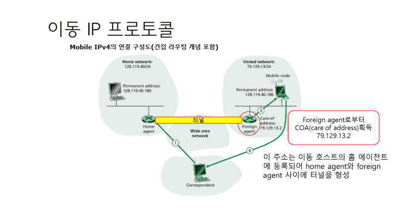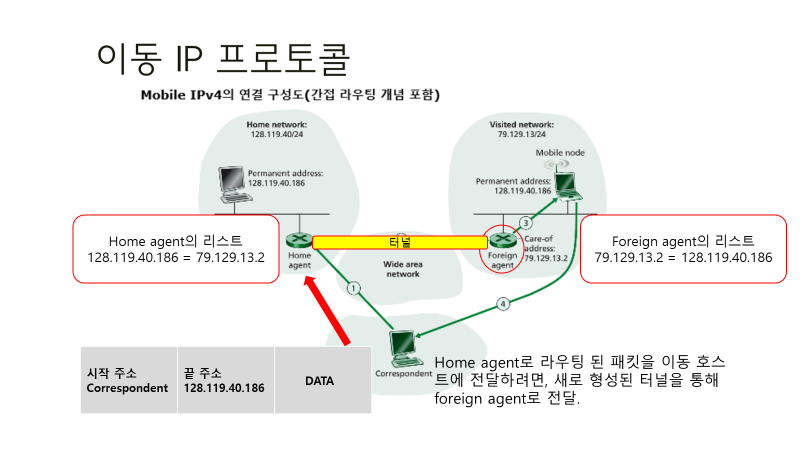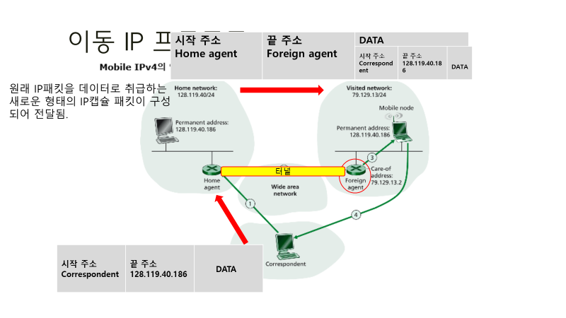 인더텟에서 IP프로토콜은 IP주소를 근거로 라우팅 하므로, 이동 호스트가 자신의 고유 주소를 유지하면서 인터넷 서비스를 받으려면 계속 이동하는 송수신 호스트 간의 데이터 라우팅 처리가 가장 중요하다.