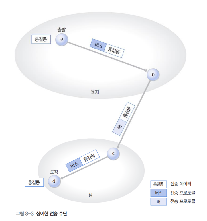 운송 수단인 버스와 배는 네트워크 계층을 지원하는 IP프로토콜이라고 볼 수 있고, 홍길동은 IP프로토콜의 전송 데이터가 된다.