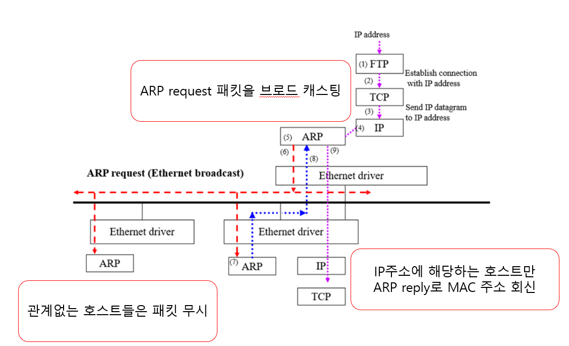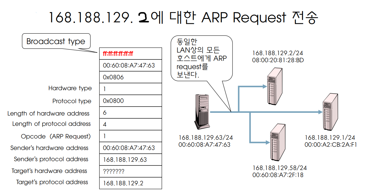 - ARP request라는 특수 패킷을 브로드 캐스팅